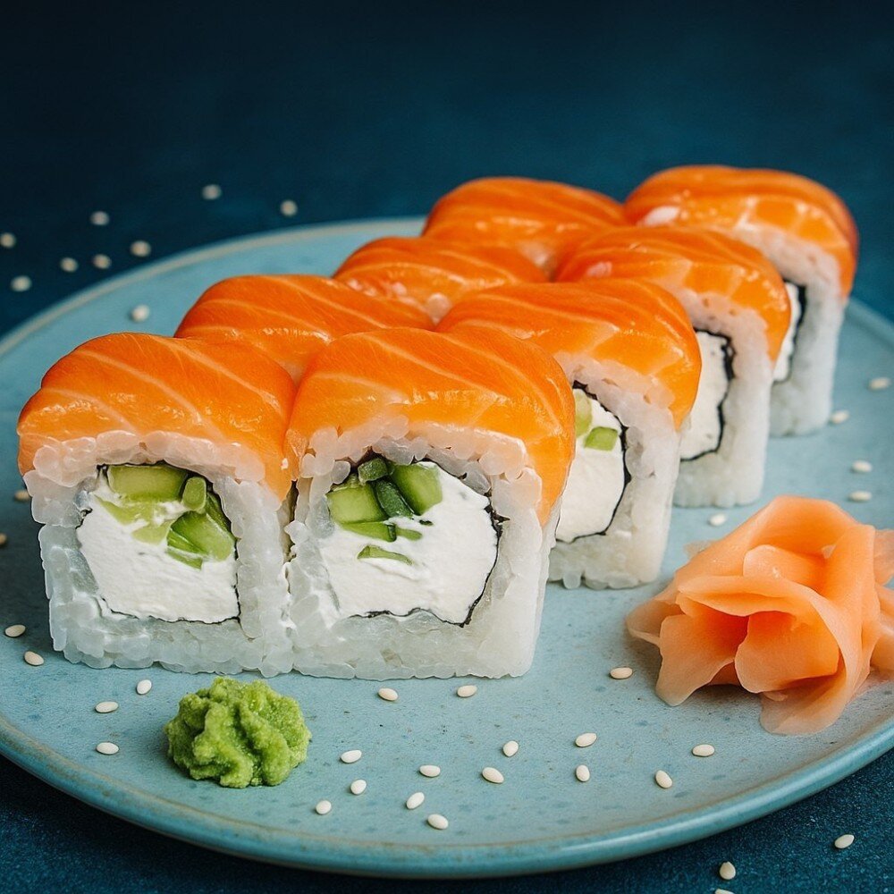 ( К этому роллу идёт соевый соус) Сыр сливочный "Cremette", лосось, огурец