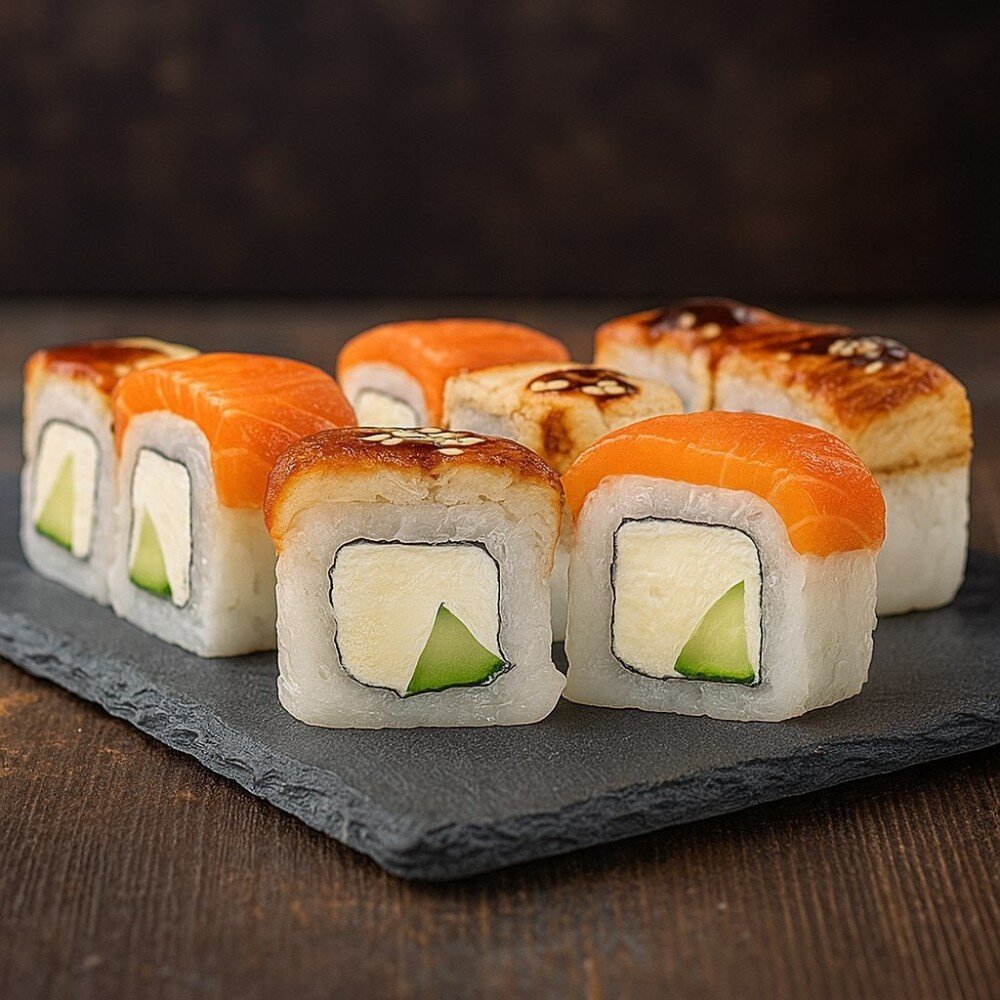 ( К этому роллу идёт соевый соус) Угорь копченый, лосось, сыр сливочный "Cremette" , огурец, соус «Унаги», кунжут