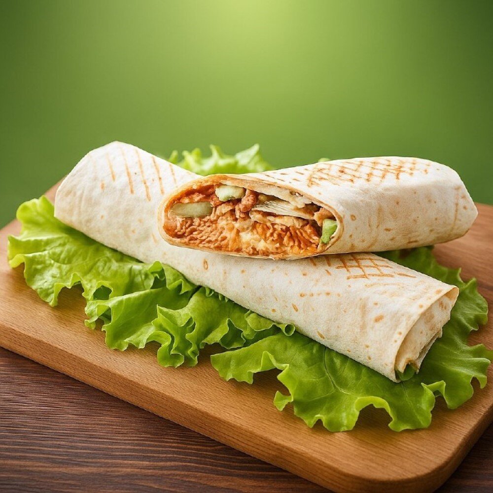 Обжаренное куриное филе, сливочный сыр, огурец, помидор, зелень, капуста, фирменный соус