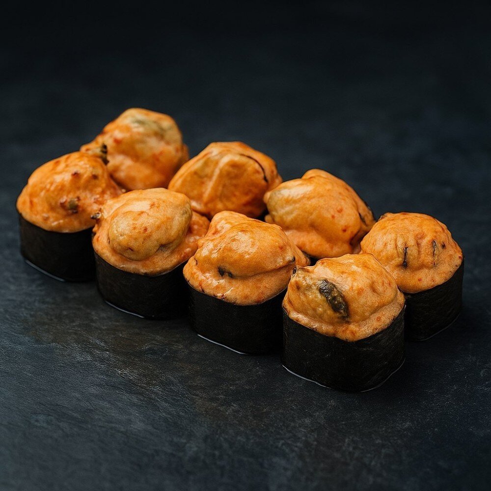Мидии, японский омлет, огурец, зеленый лук, соус «Спайси»