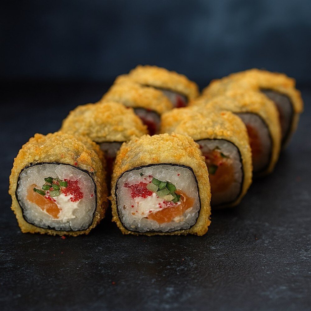 Сыр сливочный "Cremette", лосось, икра масаго, огурец, соус «Унаги», сухари панировочные