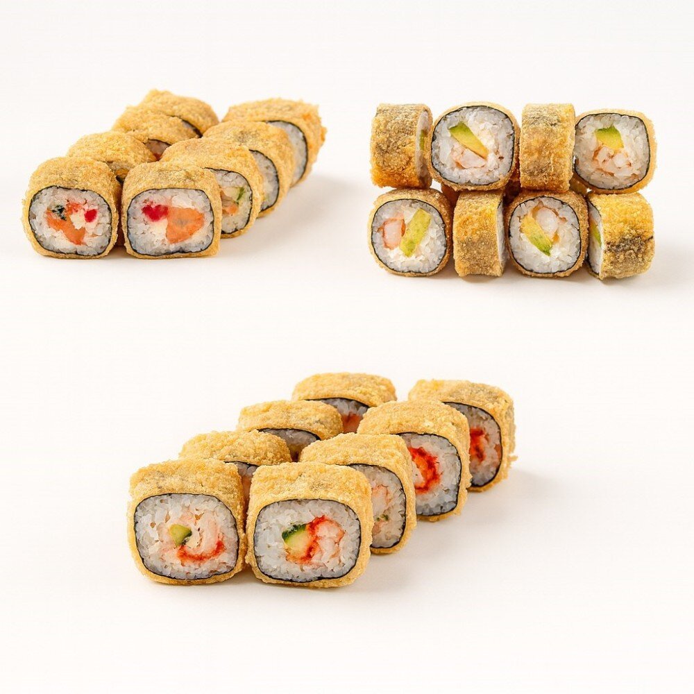 (к этому сету идёт 1 соевый, 1 имбирь, 1 васаби и 3 комплекта палочек) Ролл «Темпура Спайси», ролл «Калифорния темпура», ролл «Salmon в темпуре»