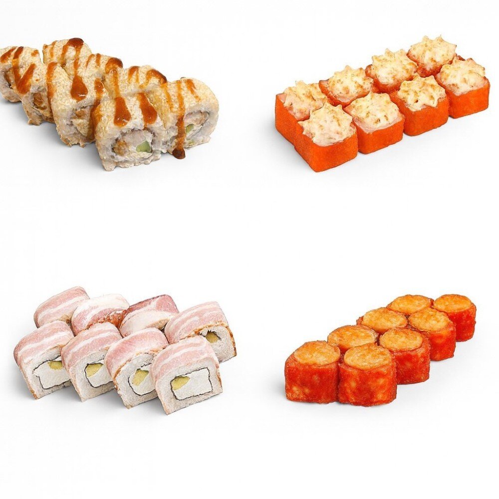 (к этому сету идёт 1 соевый, 1 имбирь, 1 васаби и 3 комплекта палочек) Ролл «Калифорния Омлет», ролл «Сливочный Бекон», ролл «Запеченная калифорния», ролл «Запеченный Эби»