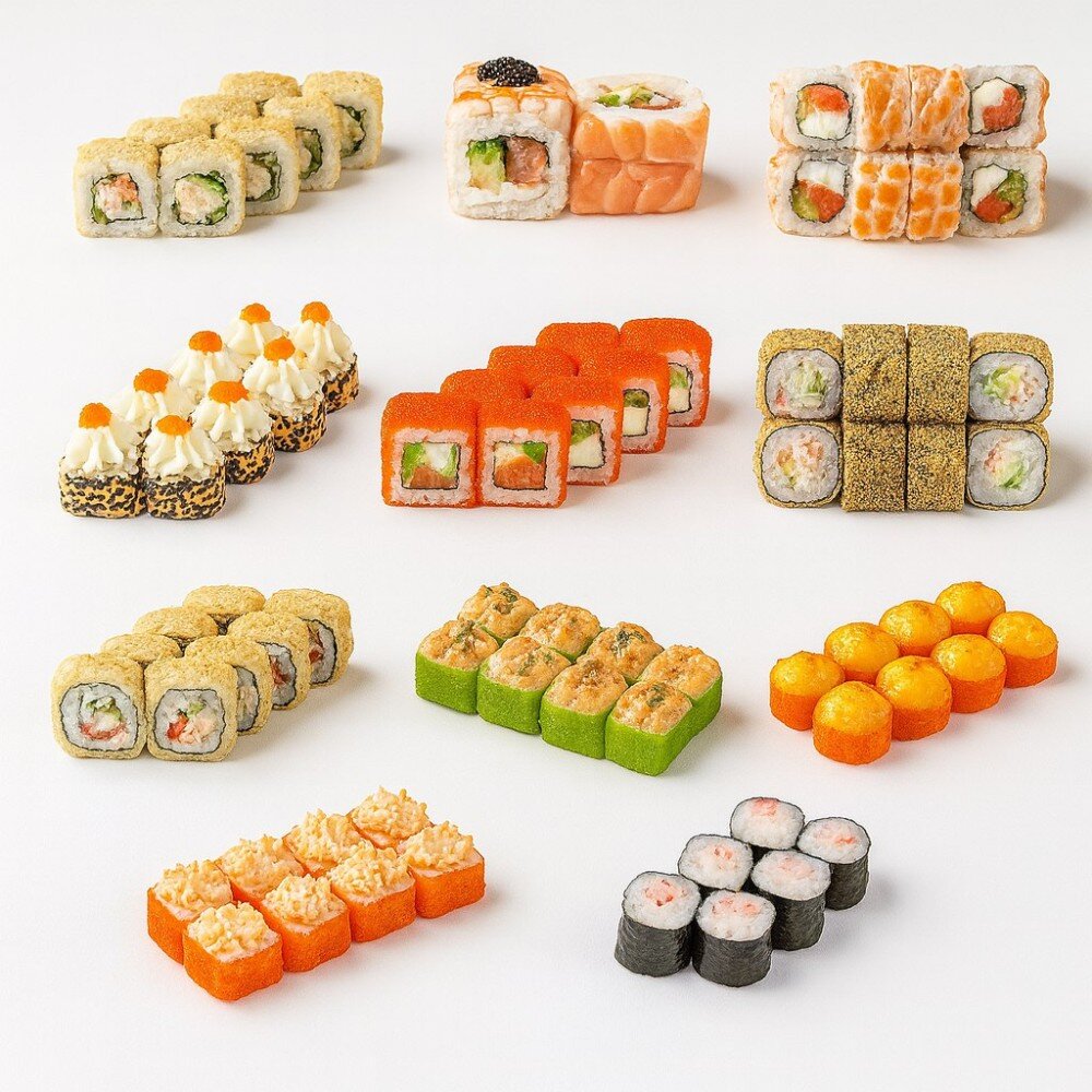 Ролл «Калифорния Sesame», ролл «Тигр», ролл с тигровой креветкой, ролл «Чикен Live», ролл «Филадельфия Лайт», ролл «Темпура», ролл «Калифорния Темпура», ролл «Запеченный угорь», запеченный ролл «Cнежный краб», ролл «Запеченная калифорния», мини ролл «Сливочный краб»