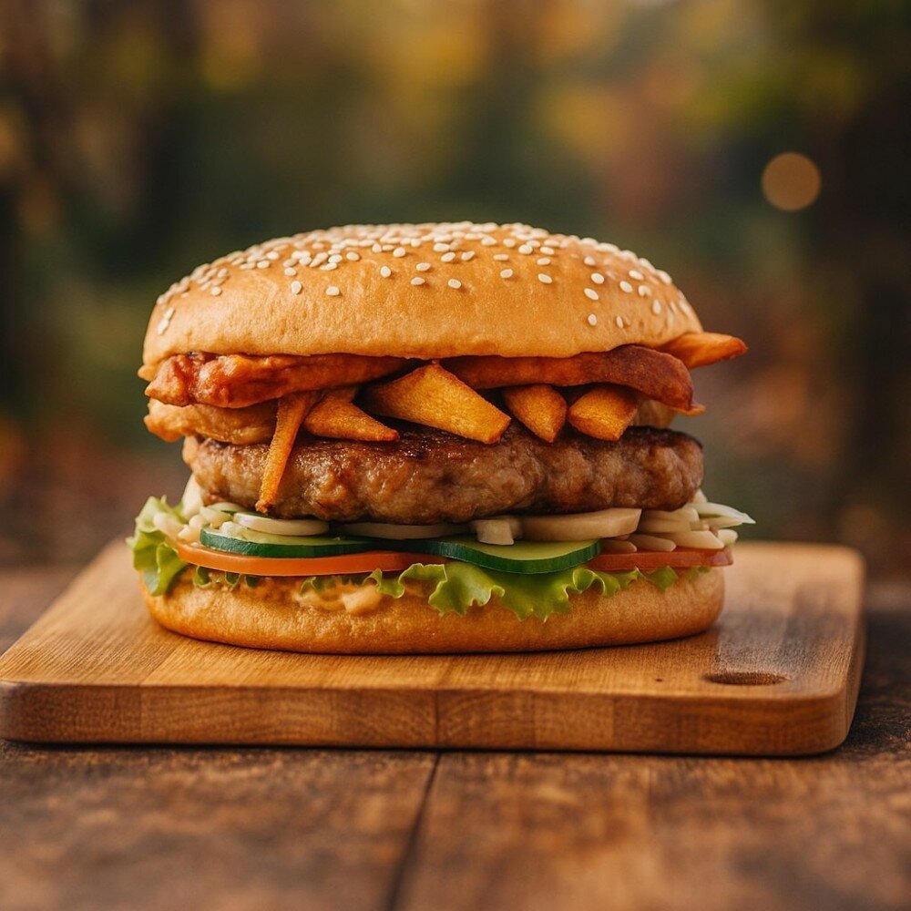 Котлета куриная, лист салата, помидор, огурец, Фри, фирменный соус