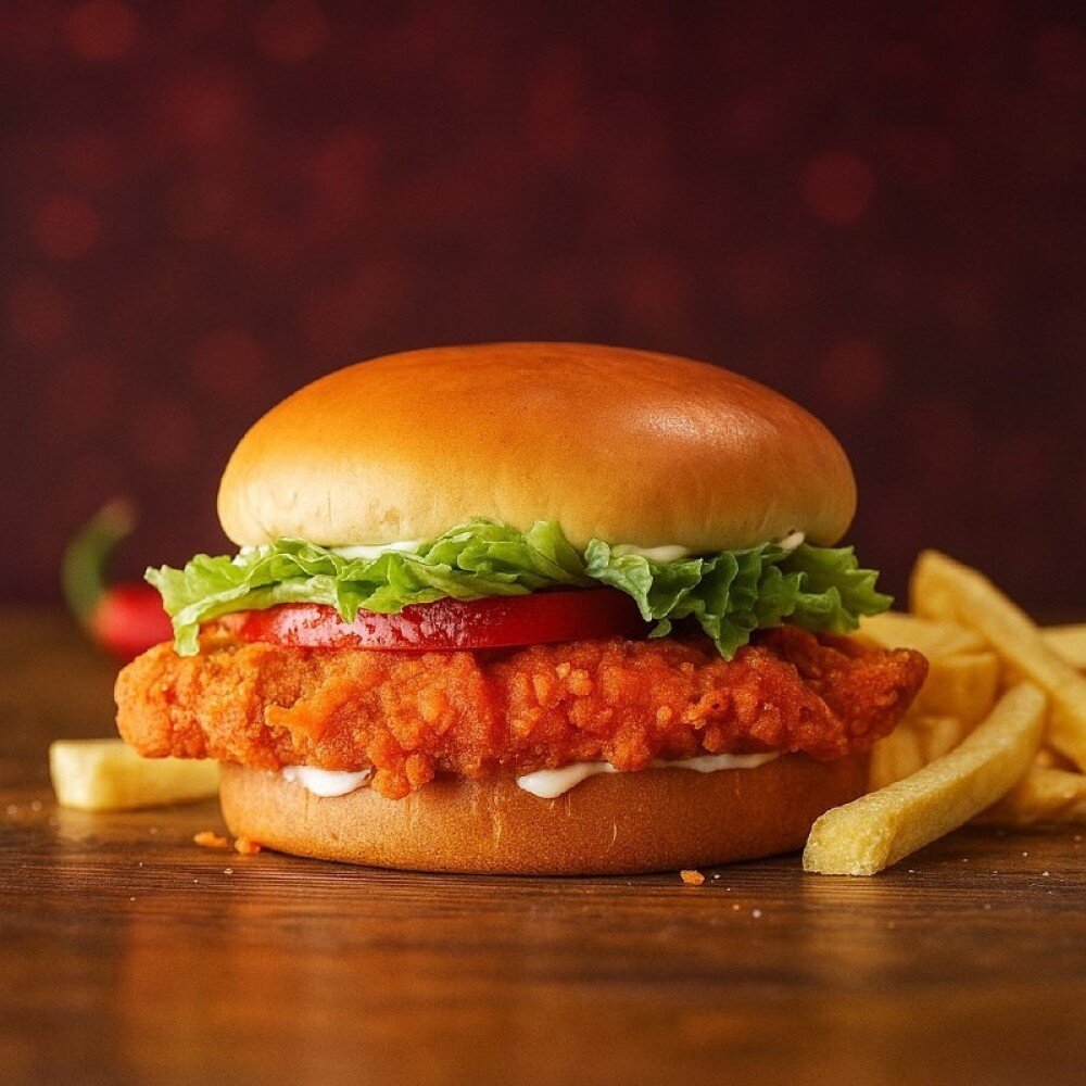 Куриное филе в панировке, лист салата, сыр, помидор, фирменный соус