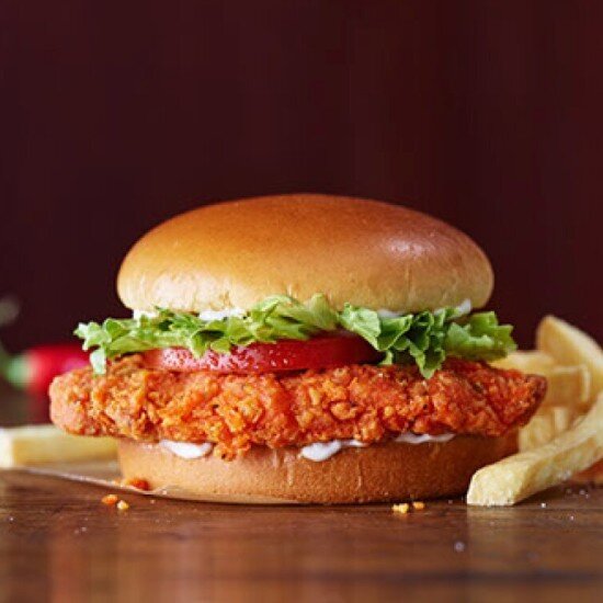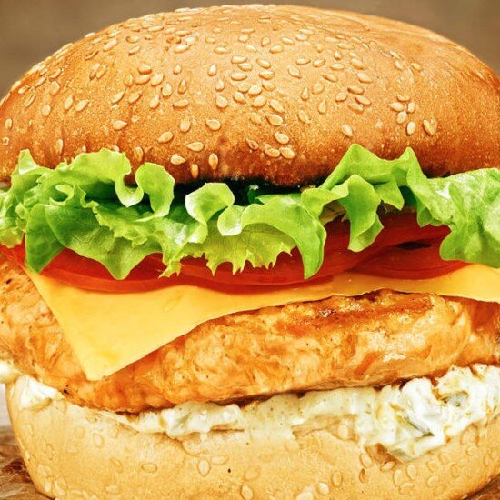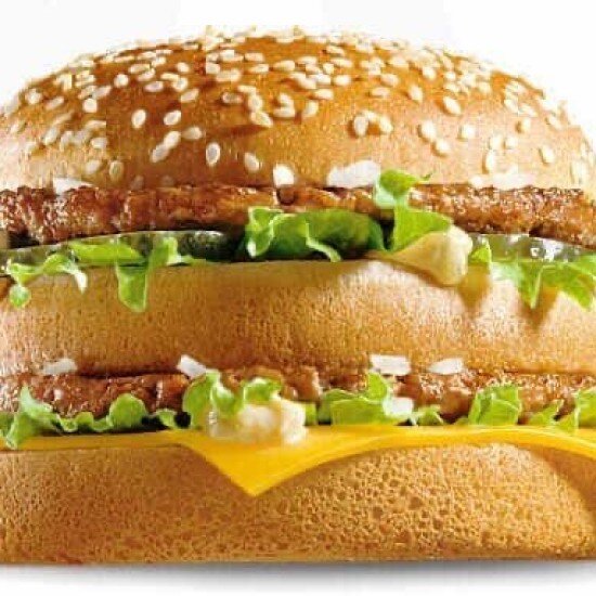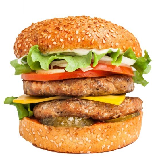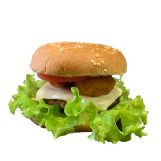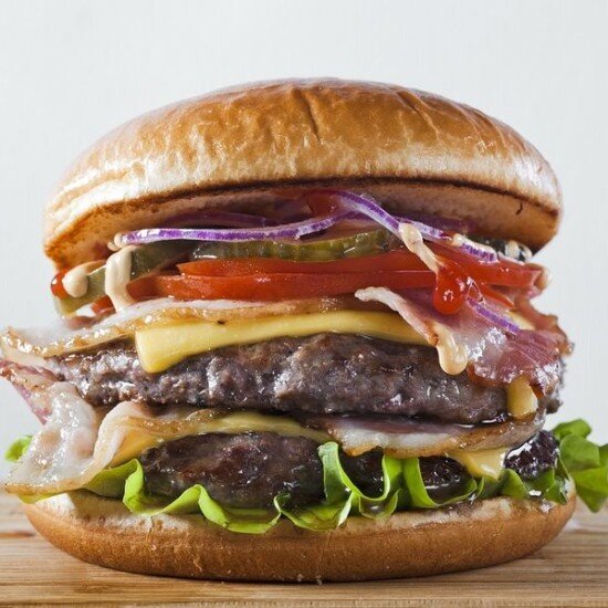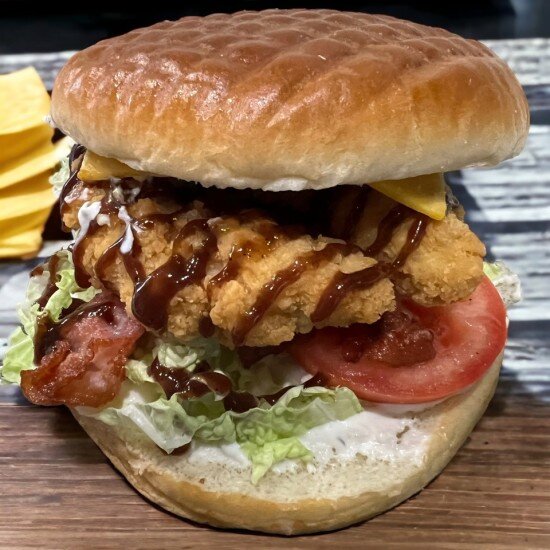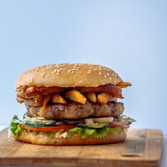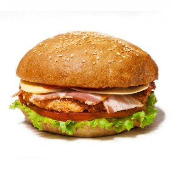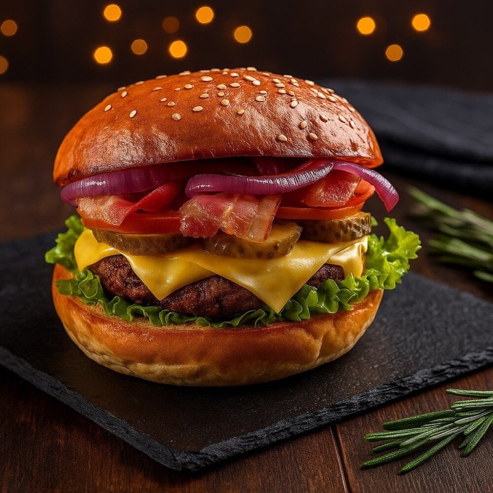Котлета говяжья, маринованный огурец, помидор, красный лук, лист салата сыр, бекон, фирменный соус