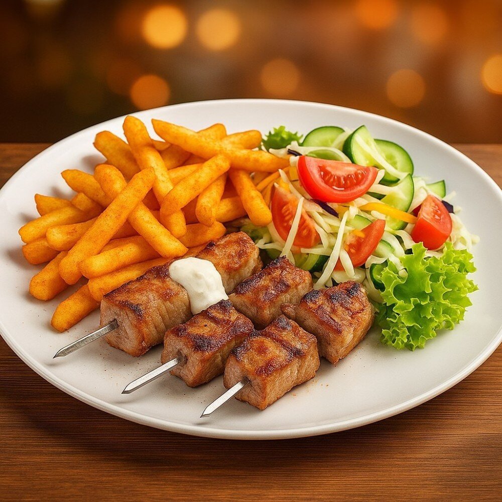 лаваш, обжаренная свинина, картофель фри, салат, фирменный соус.