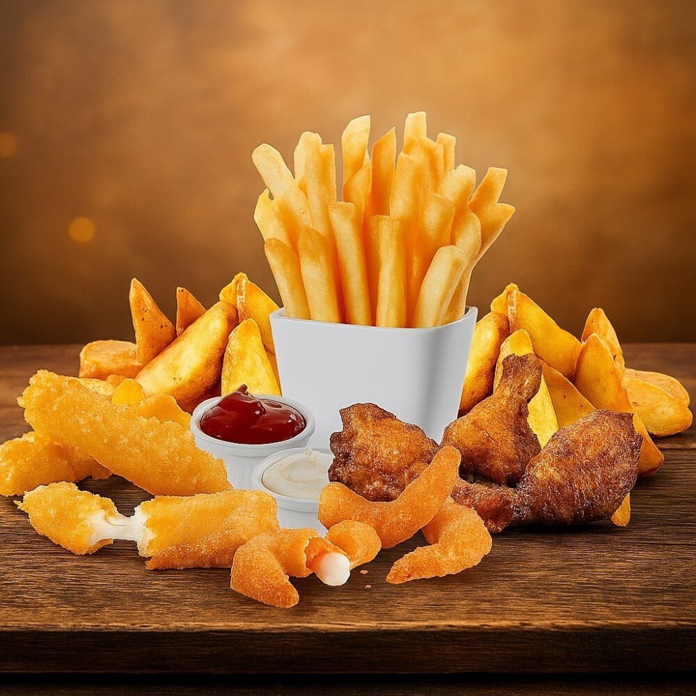 Фри, куриные крылышки, сырные палочки, картофельные дольки, королевские креветки в кляре, соус чесночный