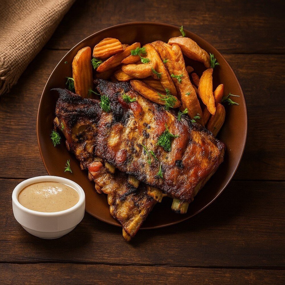 Картофель по - деревенски , ребрышко свиное , грибной соус , сыр