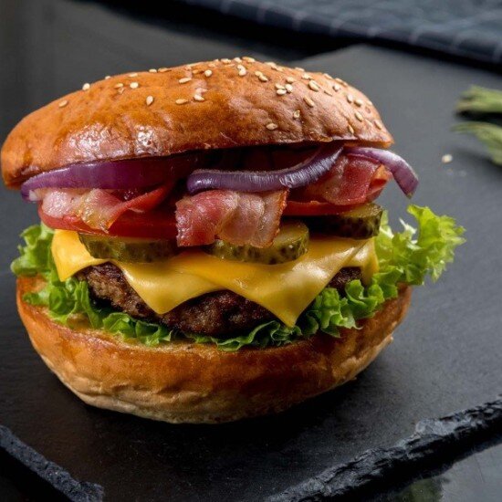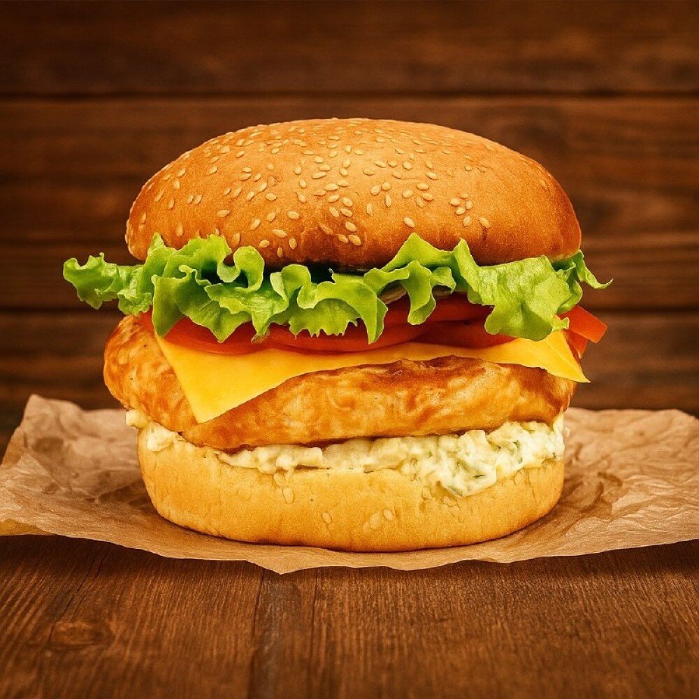 Лист салата, котлета куриная, помидор, сливочный сыр, фирменный соус