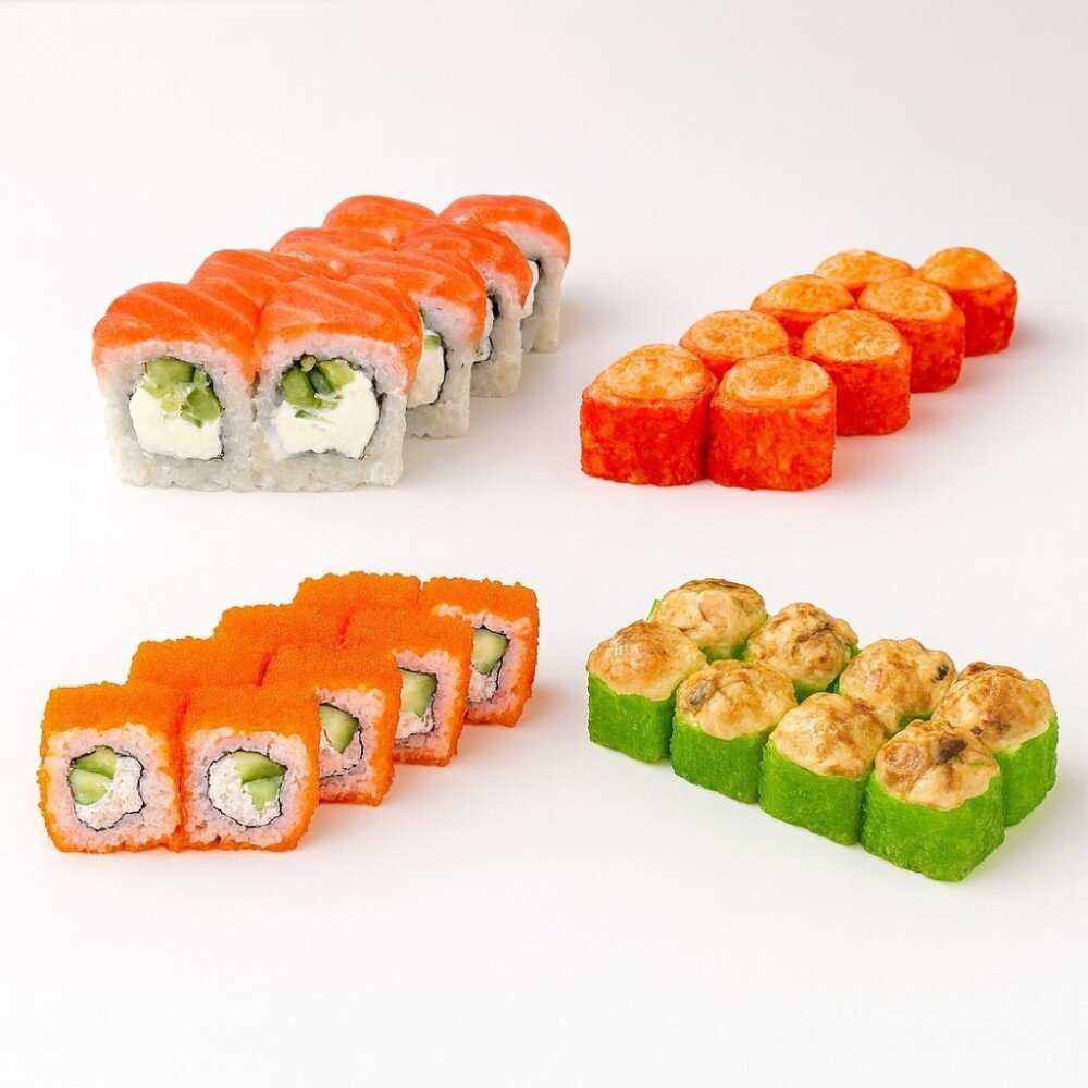 (к этому сету идёт 1 соевый, 1 имбирь, 1 васаби и 3 комплекта палочек) Ролл " Филадельфия классик", ролл «Калифорния Crab», ролл " Запеченная Эби", ролл " Запеченный угорь".