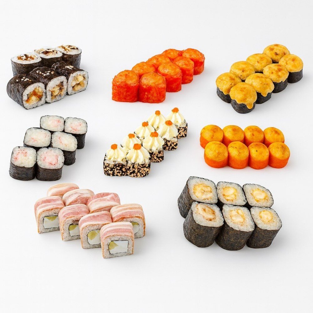 Ролл «Краб Cheese», ролл «Чикен Live», Мини ролл «Сливочный Краб», ролл «Сливочный бекон», Мини ролл «Эби Спайси», Мини ролл «Унаги c угрем», ролл «Снежный краб», ролл запеченный «Эби»