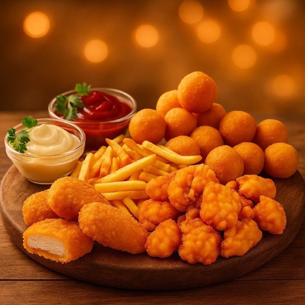 Куриный поп-корн, фри, сырные шарики ,наггетсы , сырный соус, чесночный соус