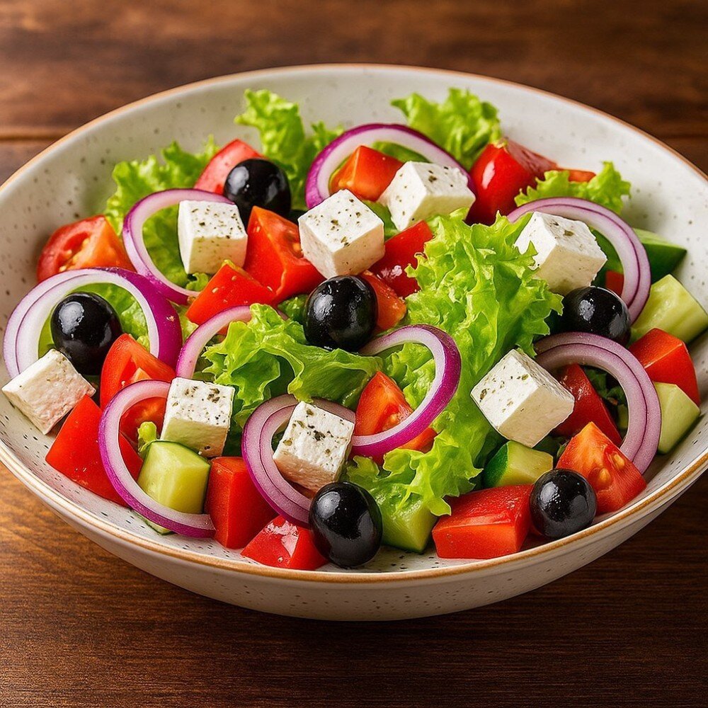 Лист салата, красный лук, черри, сыр «Фетакса», огурцы, итальянские травы, оливковое масло, маслины
