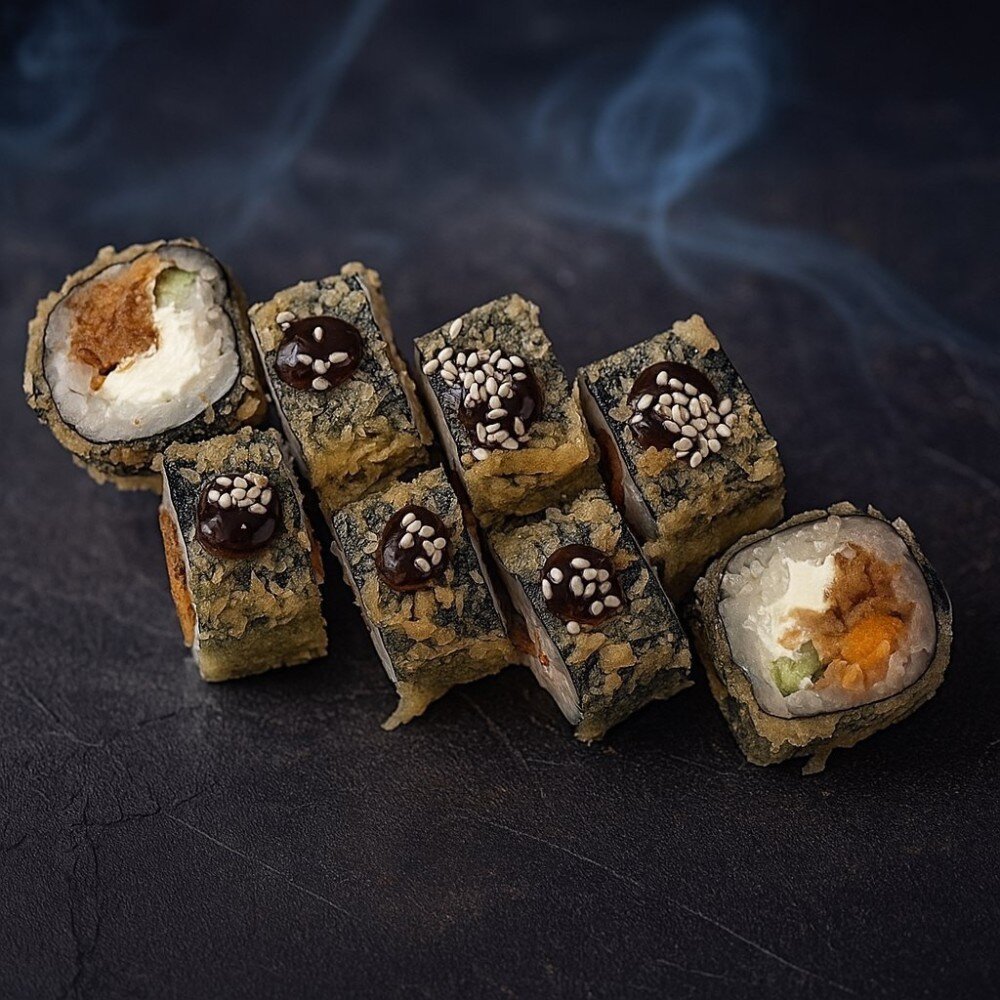 Сыр сливочный "Cremette", лосось терияки, огурец, соус «Унаги», сухари панировочные, кунжут.