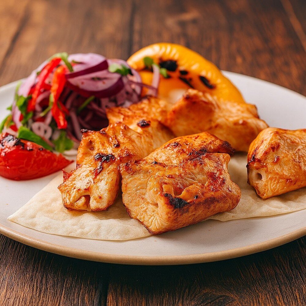 Шашлык куриный (200гр.), лук, лаваш.