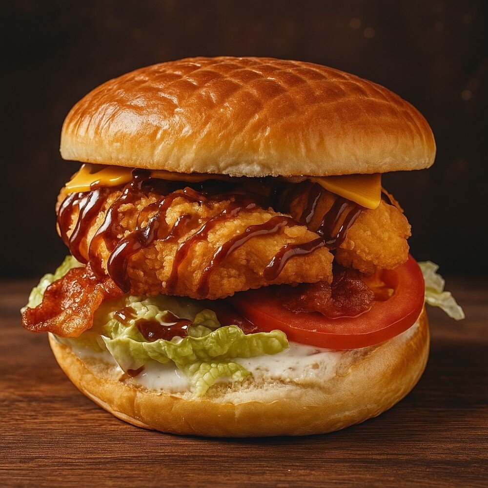 Мега - стрипсы, лист салата, помидор, бекон, сыр, барбекю, фирменный соус