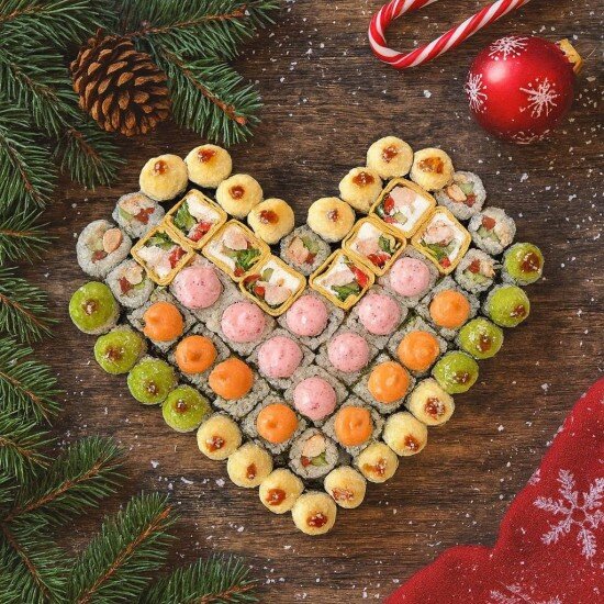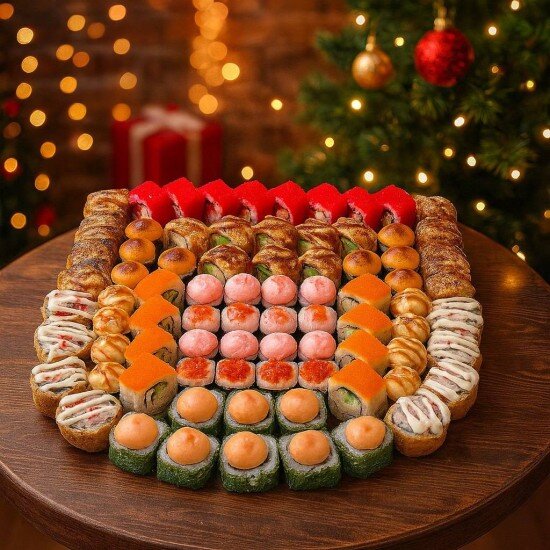 Ролл «Филадельфия Классик», Ролл "Калифорния Микс ", ролл " Креветка Хот", Ролл «Снежный Краб», Ролл " Чебурашка", Ролл "Бонито с курицей" (к этому сету идёт 1 соевый, 1 имбирь, 1 васаби и 3 комплекта палочек)