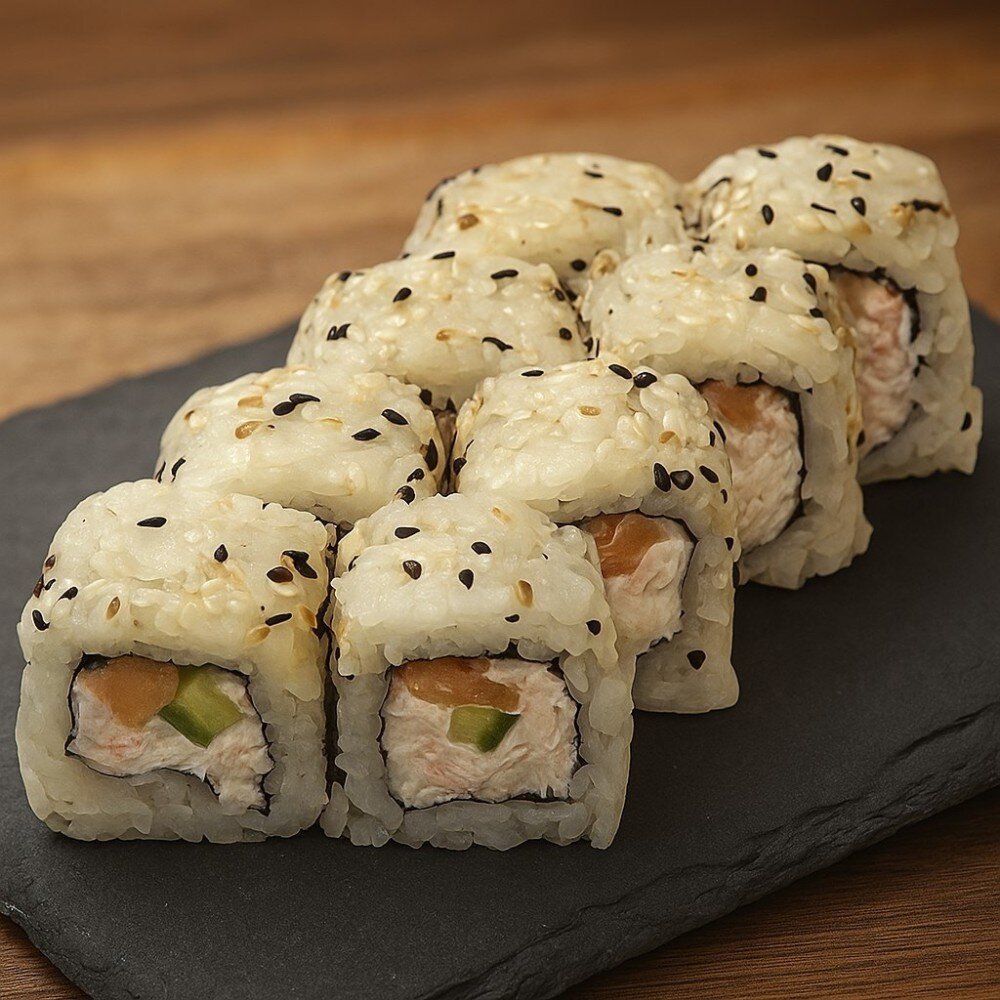 Лосось, замес краб-микс, сыр сливочный "Cremette", огурец, кунжут, рис, нори