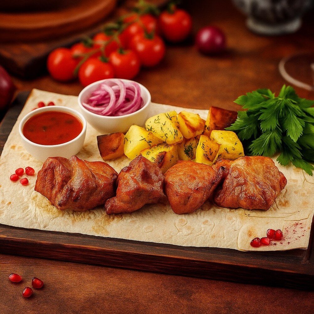 Шашлык свиной , картофель деревенский, соус, лаваш, маринованный лук