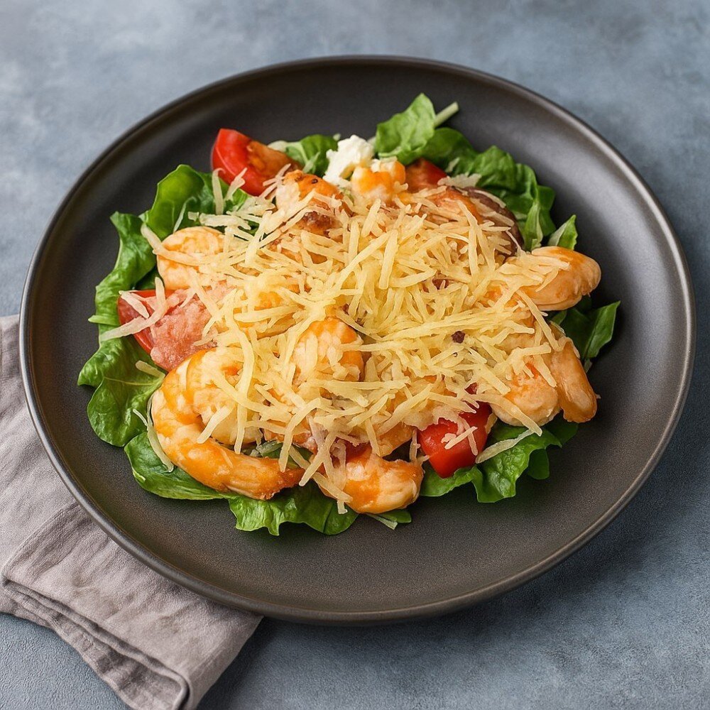Лосось копчёный, пармезан, пекинка , руккола , огурцы, помидоры черри , болг перец , королевские креветки , кунжут , фирменная заправка