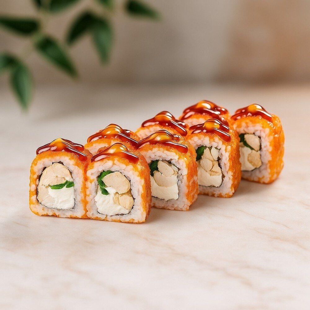 Творожный сыр, курица, зеленый лук, оранжевая икра масаго, унаги соус, спайси соус, рис, нори
