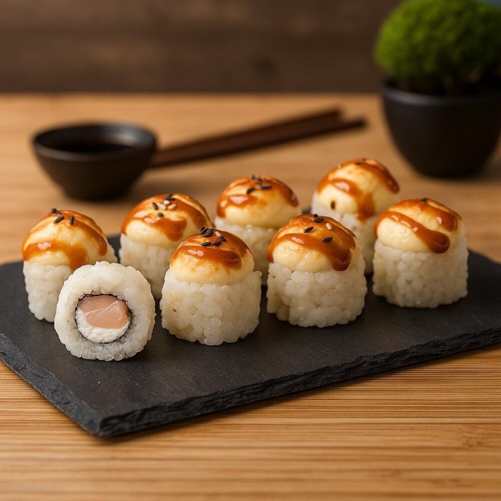 Креветка, творожный сыр, сырная шапка, унаги соус, кунжут, рис, нори