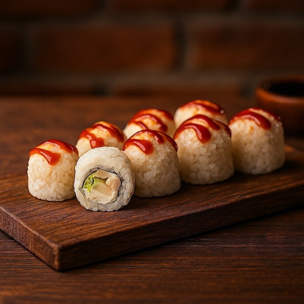 Курица, творожный сыр, капуста пекинская, унаги соус, сырная шапка с беконом, рис, нори