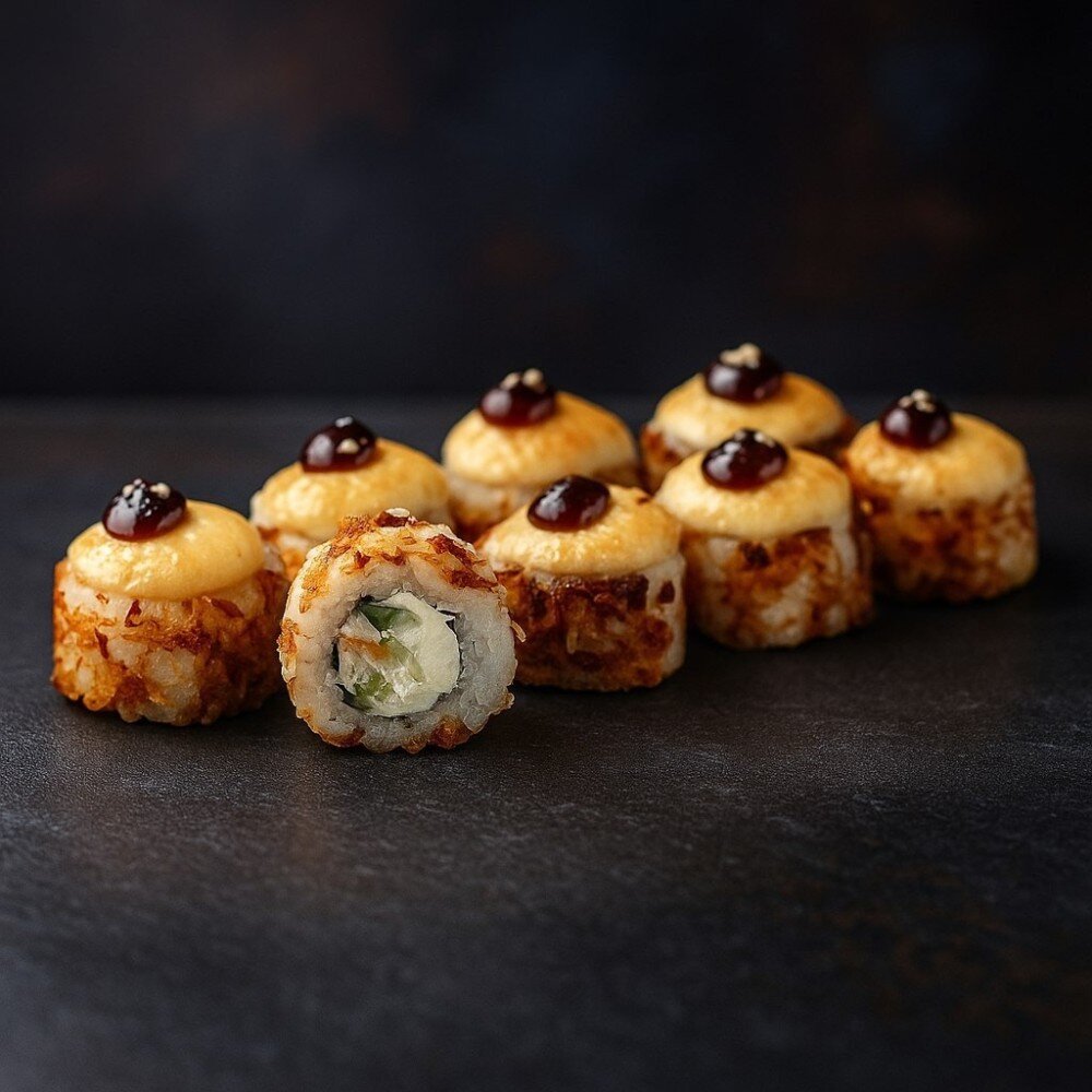 Творожный сыр, курица, огурец, лук фри, сырная шапка, барбекю соус, кунжут, рис, нори