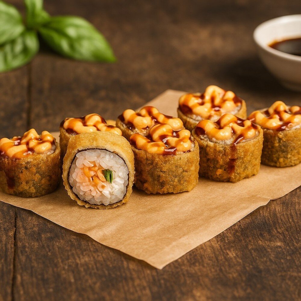 Бекон, спайси соус, зеленый лук, унаги соус, темпурный кляр, панировочные сухари, рис, нори