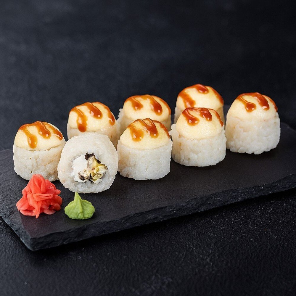 Угорь, творожный сыр, пекинская капуста, унаги соус, сырная шапка, рис, нори