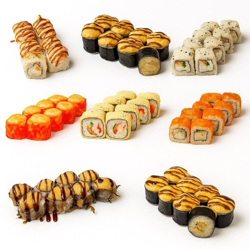 Ролл " Филадельфия Микс в Кунжуте", Ролл " Нежный с Угрём", Ролл "Креветка Хот ", Ролл «Калифорния Crab», Ролл «Калифорния Темпура», Ролл запеченный «Эби» , Ролл "Бонито с курицей", Ролл " Маки Мидии"