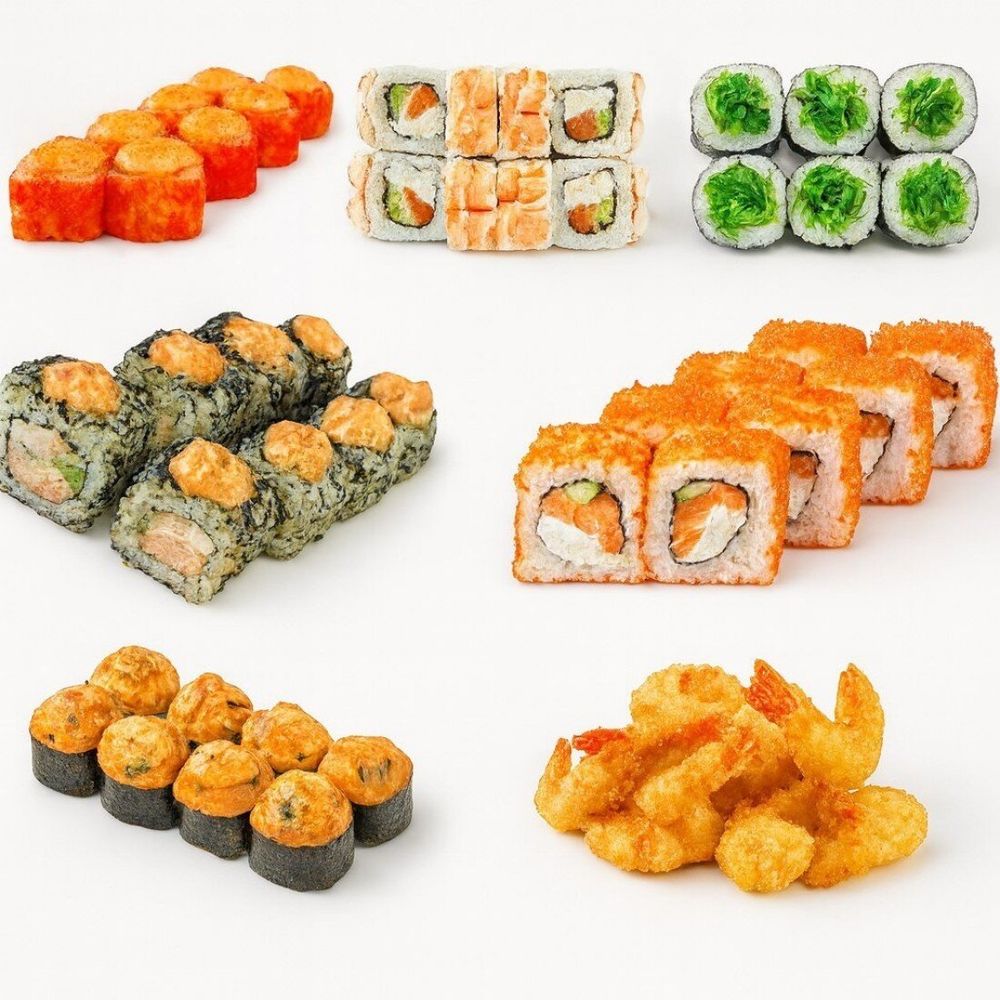 Ролл «Запеченный Эби», ролл «Горыныч», ролл запеченный «Острые мидии», ролл с тигровой креветкой, ролл «Калифорния Масаго», мини ролл с чукой, 6 креветок в темпуре. 46 шт. + 6 креветок в темпуре