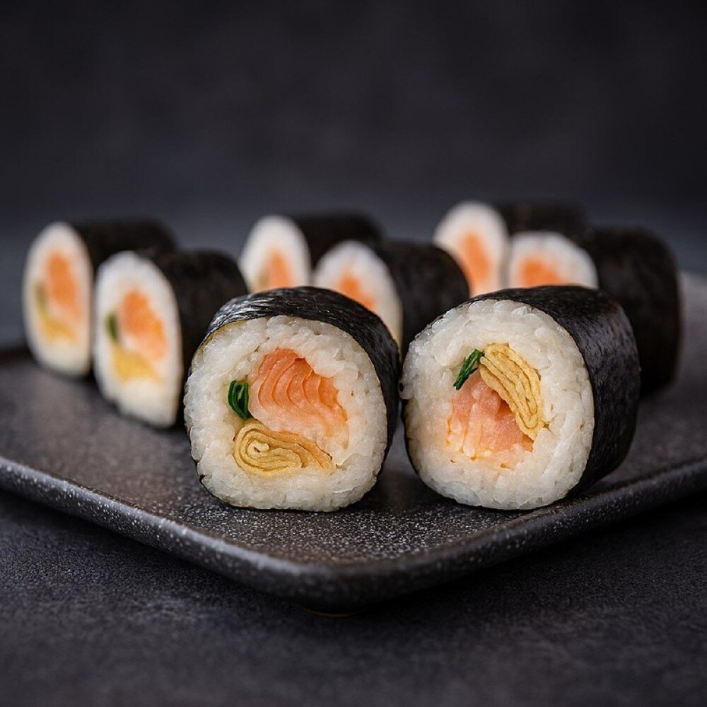 Бекон копченый, омлет японский, лук зеленый, соус «Спайси»