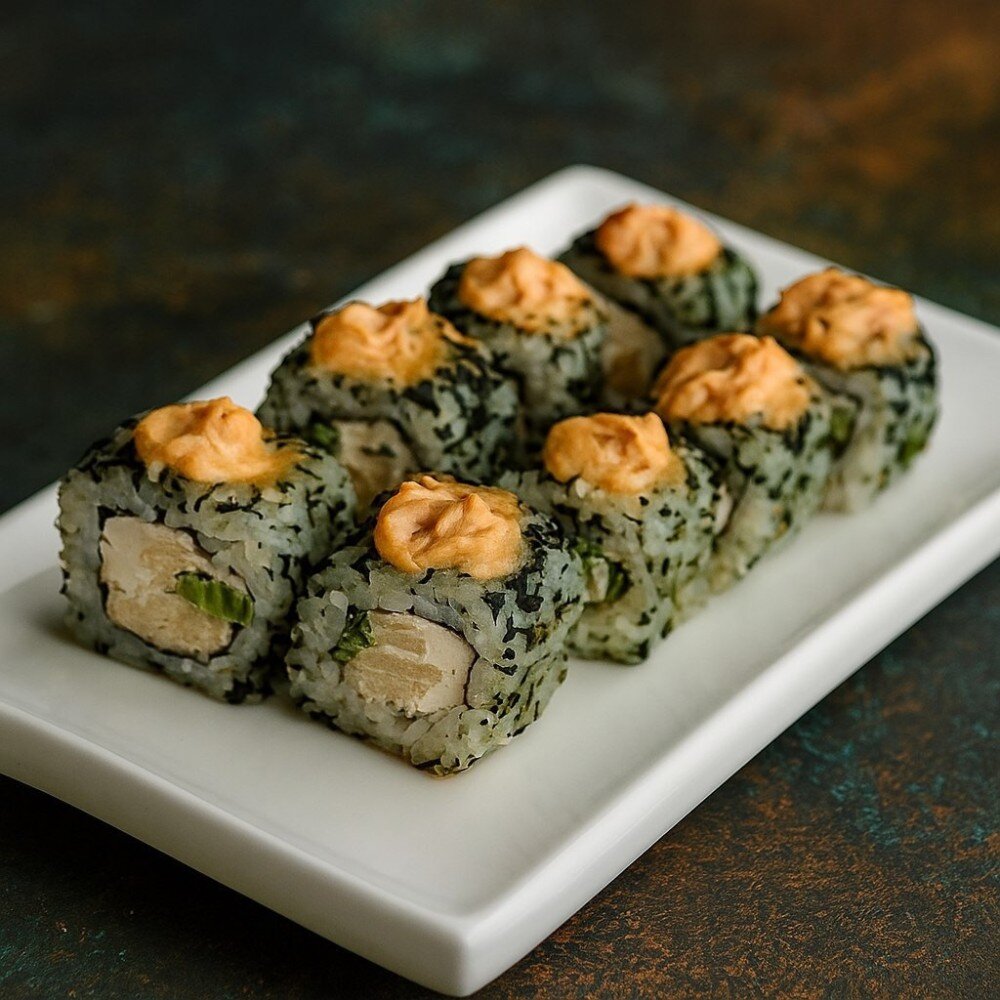 Куриная грудка, сыр сливочный "Cremette", лук зеленый, соус «Спайси», кунжут